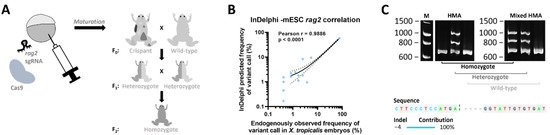 Generation of the X. tropicalis rag2−/− knockout line. (A) Embryos were injected with an sgRNA targeting the rag2 gene along with Cas9 protein. When sexually mature, animals were outcrossed to wild-types to obtain heterozygous animals that were subsequently incrossed to obtain rag2 homozygous mutant animals in the F2 generation. (B) Scatter plot showing correlation between in vivo observed mutational CRISPR repair outcomes in injected embryos (x-axis) versus predicted outcomes using the inDelphi algorithm tool (y-axis). Dashed lines show the 95% confidence interval corresponding to the best-fit linear regression line (solid line). (C) Genotyping of sampled F2 animals. Images taken from DNA electrophoresis gels after performing a normal HMA (left) and mixed HMA (right). Normal HMA included heating of the sampled PCR amplicons followed by slowly cooling and loading on the gel, while, for mixed HMA, sampled PCR samples were first mixed with wild-type rag2 amplicons, after which the HMA was performed. Multiple bands present in both gels indicate heterozygous animals, while extra bands only appearing after performing the mixed HMA (right gel) relate to homozygous mutant animals. Absence of any extra bands is indicative of wild-type animals. Presence of a 4 bp deletion in homozygous mutant animals was confirmed by Sanger sequencing.