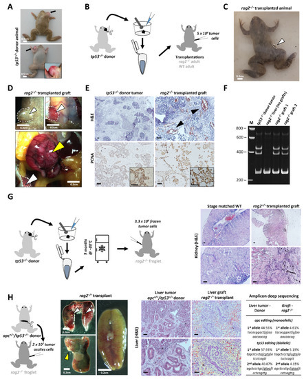 Validation of allografting in X. tropicalis rag2−/− animals. (A) tp53−/− donor animal harboring a thymic tumor (black arrows). (B) Transplantation strategy including the generation of a cell suspension using a 40 µm strainer followed by IP injections in a rag2−/− adult and a wild-type adult control (both 5 × 106 live cells). (C) A rag2−/− transplanted animal with a subcutaneous outgrowth close to the injection site (white arrow, white dashed line) 10 weeks post-transplantation. (D) Microscopy images (ventral view) of rag2−/− transplanted animal showing the engrafted tumor at the injection site before and after removal of the skin (top panels) and internal (top right and bottom). The tumor is also visible upon opening of the abdominal cavity (white arrowheads, white dashed line), in addition to a large tumor mass associated with the intestinal mesenterium (yellow arrowhead). (E) H and E and IHC stained sections from the primary tumor in the tp53−/− donor animal and the tumor graft in the transplanted rag2−/− animal. Black arrowheads indicate regions with neovascularization. (F) Mixed HMA analysis for the tp53 gene on DNA from tp53−/− tumor sample (donor animal), liver (without grafts) and two tumor grafts obtained from the transplanted rag2−/− animal. (G) Transplantation experiment starting from frozen tp53−/− tumor cells. H and E images from the rag2−/− transplant kidney versus a stage matched wild-type are shown. (H) Transplantation experiment starting from tumor ascites cells from an apc+/−/tp53−/− liver tumor bearing animal. Dissection micrographs from kidney, liver and lungs of rag2−/− transplant. Yellow and white arrowheads show visible engraftment regions in liver and lungs, respectively (left). H and E images from the liver tumor in donor animal and liver grafts in the transplanted animal (middle). The presence of tumor cells in the liver of the transplanted rag2−/− animal is confirmed by amplicon deep sequencing at the apc and tp53 target site (right). All black scale bars are 50 µm. White scale bars are 2 mm.