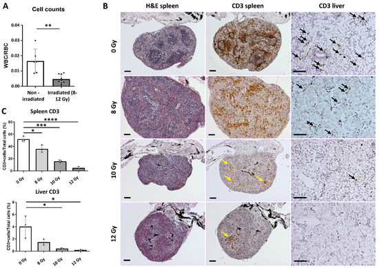 Efficient tumor cell transplantation might also be achieved via alternative techniques apart from the generation of the rag2−/− line. Immunocompromised X. laevis animals can be obtained by sub-lethal gamma irradiation [14]. In order to generate irradiated hosts in X. tropicalis, the optimal dose suitable for the successful allografting of tumor cells needed to be determined. We irradiated (X-rays) three different groups of 4-month-old X. tropicalis froglets (8 Gy (n = 3), 10 Gy (n = 3) and 12 Gy (n = 3)). Approximately one week post-irradiation, all cohorts were euthanized and dissected. Major lymphoid organs (spleen and liver) and peripheral blood were checked to address irradiation potential. Natt and Herrick peripheral whole blood staining revealed significant reduction in white blood cell (WBC)/red blood cell (RBC) ratios in irradiated animals compared with the non-irradiated siblings (p = 0.0012) (Figure 3A). Of note, no significant differences were present between the three irradiated groups. Quantification of CD3 immunohistochemical stainings revealed that irradiation majorly impacted T cell levels in both spleens and livers (Figure 3B,C). For spleens, compared with the non-irradiated controls (51.9% ± 4.5), irradiation with an 8 Gy dose already induced a significant decrease in CD3 positivity (36.0% ± 5.9, p < 0.05). This effect became more pronounced when irradiating to 10 Gy (15.7% ± 2.1, p < 0.001) and to 12 Gy (4.9% ± 1.9, p < 0.0001). Additionally, in the livers, a similar dose–ratio trend was observed (non-irradiated (4.0% ± 1.8), 8 Gy (1.5% ± 0.5, p = 0.08), 10 Gy (0.4% ± 0.1, p < 0.05) and 12 Gy (0.2% ± 0.1, p < 0.05)). We therefore propose that irradiation up to a dose of 12 Gy is preferred for the optimal reduction of T cell numbers, thereby displaying the highest potential for successful tumor transplantation applications.