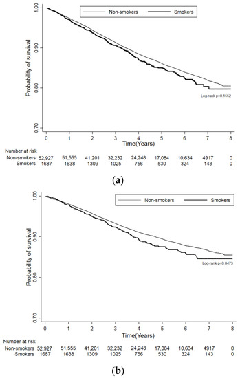 Smoking is a well-known all-cause mortality risk in the general population, with causes including vascular diseases, respiratory diseases, and cancers [7,8], and this risk decreases as the number of years after the cessation of smoking increases [9,10]. Smoking has stronger health effects in women than in men regarding the risk of several diseases, such as coronary heart disease, COPD (chronic obstructive pulmonary disease), and specific cancers such as colorectal cancer, bladder cancer, and breast cancer [11,12]. The association between smoking status and the risk of mortality in women with breast cancer has previously been investigated in several studies, but it has not been extensively explored in Asian countries.