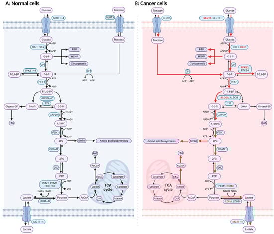 Reprogramming of glucose metabolism in cancer cells. (A) Glucose metabolism in normal cells; (B) glucose metabolism in cancer cells. Cellular uptake of glucose is followed by a series of reactions to transform glucose to pyruvate. Then, glucose enters the TCA cycle or is converted to lactate. Enzymes or pathways predominant in cancer cells are shown in bold red. Created with BioRender.com (accessed on 22 August 2022). Abbreviations: 1,3 BPG, 1,3-bisphosphoglycerate; 2-PG, 2-phosphoglycerate; 3-PG, 3-phosphoglycerate; α-KG, α-ketoglutarate; AcCoA, acetyl coenzyme A; ADP, adenosine diphosphate; ALDO, aldolase; ATP, adenosine triphosphate; DHAP, dihydroxyacetone-phosphate; ENO, enolase; F-1,6-BP, fructose-1,6-bisphosphate; F-2,6-BP, fructose-2,6-bisphosphate; F-6-P, fructose-6-phosphate; FAS, fatty acid synthesis; G-3-P, glyceraldehyde-3-phosphate; G-6-P, glucose-6-phosphate; HK, hexokinase; LDH, lactate dehydrogenase; GAPDH, glyceraldehyde-3-phosphate dehydrogenase; GCK, glucokinase; GLUT, glucose transporter; glycerol-3P, glycerol-3-phosphate; GPI, glucose-6-phosphate isomerase; MCT, monocarboxylate transporter; OAA, oxaloacetate; PEP, phosphoenolpyruvate; PFK1, phosphofructokinase 1; PFKFB, 6-phosphofructo 2-kinase/fructose-2,6-bisphosphatase; PGAM1, phosphoglycerate mutase 1; PGK1, phosphoglycerate kinase 1; PK, pyruvate kinase; PPP, pentose phosphate pathway; TCA, tricarboxylic acid; TPI, triosephosphate isomerase.