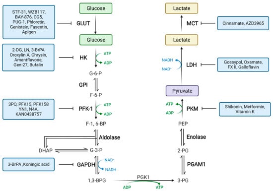 Drugs targeting glucose metabolism in cancer cells. Reprogramming of glucose metabolism provides many potential targets for cancer therapy. Created with BioRender.com (accessed on 22 August 2022). Abbreviations: 1,3 BPG, 1,3-bisphosphoglycerate; 2-PG, 2-phosphoglycerate; 3-PG, 3-phosphoglycerate; ADP, adenosine diphosphate; ALDO, aldolase; ATP, adenosine triphosphate; DHAP, dihydroxyacetone-phosphate; ENO, enolase; F-1,6-BP, fructose-1,6-bisphosphate; F-2,6-BP, fructose-2,6-bisphosphate; F-6-P, fructose-6-phosphate; G-3-P, glyceraldehyde-3-phosphate; G-6-P, glucose-6-phosphate; HK, hexokinase; LDH, lactate dehydrogenase; GAPDH, glyceraldehyde-3-phosphate dehydrogenase; GLUT, glucose transporter; GPI, glucose-6-phosphate isomerase; MCT, monocarboxylate transporter; PEP, phosphoenolpyruvate; PFK1, phosphofructokinase-1; PFKFB, 6-phosphofructo 2-kinase/fructose-2,6-bisphosphatase; PGAM1, phosphoglycerate mutase 1; PGK1, phosphoglycerate kinase 1; PK, pyruvate kinase; TPI, triosephosphate isomerase.