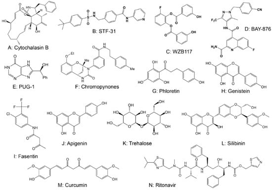 Several natural products have also been shown to suppress growth in cancer cells by inhibiting GLUT, including phloretin, genistein, fasentin, and apigenin. The polyphenol phloretin (Figure 3G) was shown to inhibit GLUT2 in triple-negative breast cancer, leading to the suppression of cancer growth and metastasis []. Additionally, phloretin can inhibit GLUT1, which is overexpressed in the hypoxic area of resistant colon cancer cell lines, and induce apoptosis by activating p53-mediated signaling, leading to suppression of growth in resistant cancer cells []. Ji et al. [] demonstrated that genistein (Figure 3H) could induce apoptosis and inhibit the proliferation of renal cancer cells by increasing CDKN2a expression levels and decreasing methylation, suggesting that genistein is also a potential therapeutic agent for cancer. Moreover, as a GLUT inhibitor, genistein can regulate miR-1260b to affect the Wnt signaling pathway to inhibit cancer tissue growth and metastasis []. Fasentin (Figure 3I) and its analogs have been shown to inhibit glucose uptake and decrease resistance to caspase activation, which is involved in the chemoresistance of cancer cells [,,]. In addition, fasentin resists angiogenesis via glucose-independent metabolism []. For most malignant tumors, angiogenesis, a hallmark of cancer, is not only a significant feature but also a drug target []. The dual mechanism of fasentin may change the current state of the treatment for malignant tumors []. Inhibition of proliferation and apoptosis induction of cancer cells by apigenin (Figure 3J) were associated with the downregulation of GLUT1 expression, which was partly dependent on the inhibition of HIF-1α []. Furthermore, apigenin reduced VEGF secretion by cancer cells under both normoxia and hypoxia, suggesting its potential to inhibit cancer metastasis [,,]. In addition, natural products such as trehalose (Figure 3K) [], silibinin (Figure 3L) [], curcumin (Figure 3M) [], resveratrol (Figure 3N) [], naringenin [], quercetin [], isoquercetin [], kaempferol [], xanthohumol [], caffeine [], bezielle [], theophylline [], (+)-Cryptocaryone [], and melatonin [] also have inhibitory effects on GLUT1. Moreover, natural product compounds generally have better safety and less toxicity in comparison to synthetic drugs. For example, Baeckea frutescens leaf extracts could inhibit tumor growth by reducing glucose uptake in breast cancer cells, but there was no obvious cytotoxic effect on normal cells []. However, various natural products usually have the limitations of low stability and solubility in the physiological environment and low delivery efficiency due to multi-targeting and low site-specific distribution in the lesion. Thus, drug delivery systems have been designed to improve those disadvantages, such as liposomes, inorganic metal frames, and hydrogels [,,]. Computational modeling and computer-aided drug design have contributed immensely to the successful development of drugs, especially in the contemporary pharmaceutical and drug industries. Integrating computer-aided drug design (CADD) into the development of GLUT has contributed to the enhancement of selective drug targeting with reduced toxicity and off-target effects [,,]. However, few studies exist directly comparing the efficacy and safety of synthetic chemicals against natural substances for targeting glucose transferase (GLUT). We expect that these issues will attract more attention and contribute to intensive research.