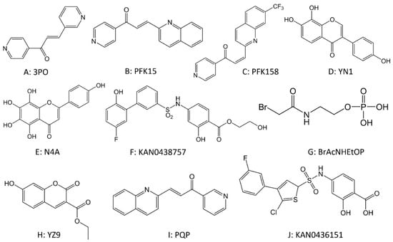 PFK is controlled by a family of bifunctional enzymes, including PFKFBs []. PFKFB3 is overexpressed in various cancers, including breast, colon, nasopharyngeal, pancreatic, and gastric cancers, and is associated with lymph node metastasis and survival []. A large number of inhibitors of PFKFB3 have been reported, including 3PO (Figure 5A) [,], PFK15 (Figure 5B) [], PFK158 (Figure 5C) [,], YN1 (Figure 5D) [], and N4A (Figure 5E) []. In contrast to 2-DG, which can cause serious toxicity and systemic adverse effects, 3PO only partially and transiently reduces glycolysis without causing serious toxicity to normal tissues. Administration of 3PO was shown to produce a rapid reduction in glucose uptake, lactate production, and ATP generation in Jurkat T-cell leukemia cells []. PFK15, a derivative of 3PO, exhibits approximately a 100-fold increase in PFKFB3 inhibitory activity when compared to 3PO. PFK15 has been reported to exhibit significant anticancer activity by reducing 18FDG uptake and F-2,6-BP levels in xenografted tumors. Moreover, PFK15 exhibits a proapoptotic effect in transformed cancer cells in vivo and in vitro []. Several studies have demonstrated the ability of PFK15 and PFK158 to synergize with targeted and chemotherapeutic agents [,,]. In addition, it has also been shown that PFK15 increases the sensitivity of chronic granulocytic leukemia cells to imatinib and enhances the cytotoxicity of oxaliplatin against colorectal cancers [,]. The combination of CTLA-4 antibody and PFK158 can significantly enhance the inhibition of cancer growth, showing a bright future for immunotherapy combined with targeted glucose metabolism therapy []. Some studies have found that PFKFB3 plays a key role in the repair of DNA damage by homologous recombination, leading to the development of the small-molecule PFKFB3 inhibitor KAN0438757 (Figure 5F), suggesting that PFKFB3 may play a key role in the initiation and development of malignant tumors []. Moreover, compounds such as BrAcNHEtOP (Figure 5G) [], YZ9 (Figure 5H) [], PQP (Figure 5I) [], KAN0436151 (Figure 5J), benzindoles [], and salicylic acid sulfonamides [] have also been found to have pharmacological effects on PFK inhibition.