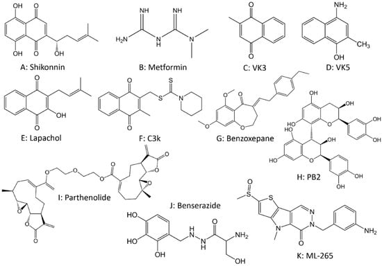 There are three main types of PKM2 inhibitors that have been identified: shikonin, metformin, and vitamin K. Shikonin (Figure 6A), the active ingredient extracted from the plant comfrey, is the most potent and specific PKM2 inhibitor reported to date. Shikonin’s analog, alkannin, also shows potential anticancer therapeutic value in targeting PKM2 []. Shikonin reduces platinum resistance in human colorectal and advanced bladder cancer cells by inhibiting PKM2 activity and reverses cisplatin resistance in cervical cancer cells in a dose-dependent manner []. In addition, shikonin significantly reduced gefitinib resistance in lung cancer cells and inhibited the development and metastasis of esophageal and bladder cancers [,]. However, due to shikonin’s poor solubility and complex pharmacological activity [], there are still many safety concerns for its direct incorporation into treatment protocols. Therefore, optimizing the drug structure to target and enhance anticancer activity, utilizing nanoformulations, and other methods to enhance drug solubility are ways to overcome these limitations. In the past decade, various advanced drug delivery systems have been widely reported, including nanoparticles [,], liposomes [,,], microcapsules [], electrospun nanofibres [], microemulsions [], microneedles [], polymeric micelles [], etc. These nano-delivery systems transcend the limitations of conventional carrier systems and facilitate the precise delivery of shikonin and its derivatives to the target site of action [,,]. Metformin (Figure 6B) is a commonly recommended drug for type II diabetes mellitus, but several studies have shown that metformin also has high potential as an anticancer agent []. Metformin enhanced the sensitivity of osteosarcoma stem cells to cisplatin by decreasing the expression level of PKM2 and inhibited glucose uptake, lactate production, and ATP production in osteosarcoma stem cells []. In addition, the combination of metformin and anti-ENO1 antibody significantly reduced the resistance of human non-small cell lung cancer cells to cetuximab and activated AMPK to downregulate PKM2 to inhibit metastasis and invasion of kidney cancer cells []. However, metformin is not highly selective for PKM2, and its pharmacological effects and clinical applications in other fields are very complicated. Therefore, the clinical use of metformin for cancer therapy needs further exploration. Vitamin K (VK) is a fat-soluble naphthoquinone, of which the VK3 (Figure 6C) and VK5 (Figure 6D) isoforms can inhibit PKM2 with an inhibitory effect that is more significant than that of PKM1 []. Studies have shown that the combination of VK3 and vitamin C (VC) can improve the therapeutic effect [] and clinical trials have shown that VK3 can reverse cellular resistance to doxorubicin and adriamycin []. However, the clinical use of VK as an adjuvant for reversal of drug resistance is limited, which may be related to the contraindication of the use of VK for hepatic dysfunction, as patients with cancers treated with long-term chemotherapy are prone to impaired liver function or hepatic dysfunction, which essentially limits the application of VK in anticancer therapy. Zhou Y et al. [] recently discovered that benserazide (Figure 6J), a dopa decarboxylase inhibitor for Parkinson’s disease, was also able to specifically bind and block PKM2 enzyme activity and inhibit glycolysis, which inhibited the growth of melanoma. Such discoveries provide additional ideas for drug combinations for the treatment of cancers. In addition, several compounds, such as lapachol (Figure 6E) [], C3k (Figure 6F) [], benzoxepane derivatives (Figure 6G) [], cyclosporin A (CsA), tannic acid (TA), and beta-elemeneand can inhibit PKM2, leading to the suppression of glycolysis in cancer cells.