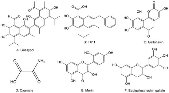There is currently much research devoted to the search for selective inhibitors of LDHA []. The natural compound gossypol (Figure 7A), a nonselective LDHA inhibitor, has shown efficient anticancer activity in vitro and in preclinical experiments, but gossypol also interacts with other components in the cell involving multiple biological functions, leading to nonspecific toxicities []. Therefore, there is a need to design chemically synthesized LDHA inhibitors to improve the efficiency and safety of these drugs. FXII (Figure 7B), a catechol-containing small compound that inhibits LDHA, was shown to inhibit tumor growth in xenografts []. In lymphoma and pancreatic cancer, FX-11 can reduce cellular lactate production, induce oxidative stress, and ultimately lead to apoptosis and the inhibition of cancer progression []. In prostate cancer, FX-11 as a single agent was also shown to be effective in inhibiting the glycolysis of cancer cells and consequently the growth of cancer cells []. In addition, galloflavin (Figure 7C) has been reported to bind to free LDHA and inhibit glycolysis in breast cancer cells, which inhibits cancer growth []. Oxamate (Figure 7D) is a competitive LDH inhibitor that exerts its pharmacological effects by competing with the LDHA substrate pyruvate. When combined with LDHA, oxamate can inhibit the conversion of pyruvate to lactate by inhibiting LDH and inhibiting the proliferation and migration of prostate and breast cancer [,,], and its sensitivity can be effectively improved when combined with temozolomide []. However, in vitro studies have shown that oxalate requires concentrations above the millimolar level to exert anticancer effects. Notably, oxidative cancer cells are less sensitive to LDHA inhibitors, while some glycolytic cancer cells will compensate for the inhibition of glycolysis by OXPHOS and become resistant to LDHA inhibitors. Therefore, LDHA inhibitors can be used in combination with OXPHOS inhibitors (e.g., phenylephrine) to exert a more comprehensive anticancer effect []. In addition, morin (Figure 7E), EGCG (Figure 7F), the NADH competitive inhibitor GSK2837808A [], pyruvate and NADH competitive inhibitors NHI1 and NHI2 [], metamorphic inhibitor PSTMB [], and piperidine derivative GNE140 [] all have strong inhibitory and selective effects on LDHA and can inhibit cancer progression with less effect on normal cells, and are therefore considered as potential novel anticancer drugs [].