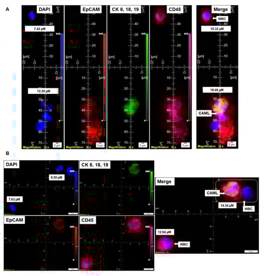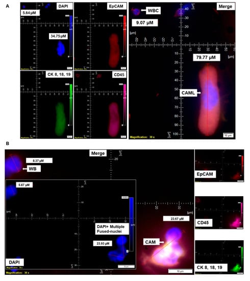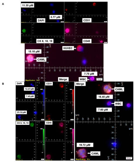 CTC was determined by triple-immunofluorescence (CellSieveTM; Creatv Microtech, Potomac, MD, USA) following isolation using lithographic microfilters as presented elsewhere [15]. In short, 7.5 mL of blood was collected in CellSave collection tubes. CTC and CAMLs were collected on the surface of the microfilter membrane aided by a syringe pump (KD Scientific Legato 110 CMT; Analytical West, Inc., Lebanon, PA, USA) assembled with filter holder assembly (Creatv Microtech; Potomac, MD, USA) and then enumerated using a kit with either DAPI/CK-FITC/EpCAM-PE/CD45-Cy5 or DAPI/CK-FITC/CD31-PE/CD45-Cy5, as procured from Creatv Microtech. Parallel blood samples were spiked with AN3CA/RL-95-2/NCI-H441 tumor cells. Immunofluorescence identified CAMLs parallel to CTCs by immuno-cytochemistry (ICC), as mentioned elsewhere [6,15]. Details of the CellSieveTM CTC Enumeration Standard Kit (Creatv MicroTech, Inc.) are Chroma Part #49000 for DAPI, 49020 for FITC, CellSieve-PE for TRITC/PE, and CellSieve-Cy5 for Cyanine5. We used Cytokeratin 8 and 18 (B22.1 and B23.1) (#818M-94) and Ep-CAM/Epithelial Specific Antigen (Ber-EP4) (248M-94) from Cell Marque. The images were acquired using an Olympus cellSens 1.18 LIFE SCIENCE IMAGING SOFTWARE (OLYMPUS CORPORATION). We used the principle of CD45−/CK8,18,19+/EpCAM+/DAPI+ for determining the CTCs (FDA-approved definition of CTC) and CD45+/CK8,18,19+/EpCAM+/DAPI+ for determining CAMLs by the immunofluorescence method. DAPI was used for the evaluation of the nuclear size and morphology. The measurement of the cell and nuclear diameters are presented in the photomicrographs of Figure 1, Figure 2, Figure 3, Figure 4 and Figure 5.