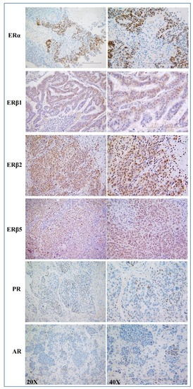 Immunohistochemical analysis of six hormone receptors in primary high-grade serous ovarian cancer (HGSOC). Representative pictures for ERα, ERβ1, ERβ2, ERβ5, PR, and AR immunostaining in HGSOC patients (magnification 20×, 40×), displaying both nuclear and cytoplasmic protein expressions.