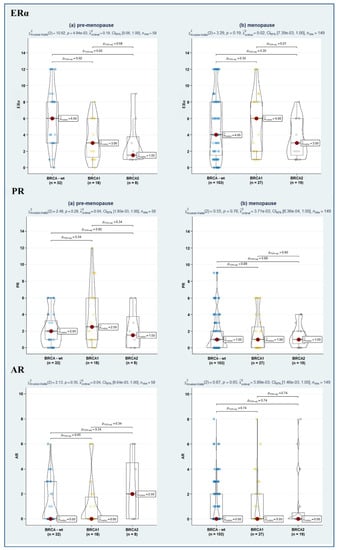 Violin plots depicting the relationship between ERα (upper panel), PR (in the middle), and AR (lower panel) in BRCA-wt, BRCA1, and BRCA2 mutated women according to menopausal status. Both overall and pairwise comparisons are reported, with FdR correction. Blue, yellow and grey dot respectively represents BRCA-wt, BRCA1 and BRCA2 patients pertaining that score of molecular marker.