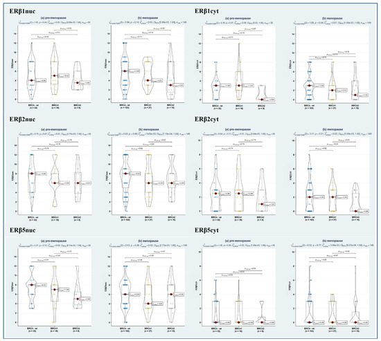 Violin plots depicting the relationship between ERβ1nuc (upper left panel), ERβ1cyt (upper right panel), ERβ2nuc (middle left panel), ERβ2cyt (middle right panel), ERβ5nuc (lower left panel), and ERβ5cyt (lower right panel) in BRCA-wt, BRCA1, and BRCA2 mutated women according to menopausal status. Both overall and pairwise comparisons are reported, with FdR correction. Blue, yellow and grey dot respectively represents BRCA-wt, BRCA1 and BRCA2 patients pertaining that score of molecular marker.