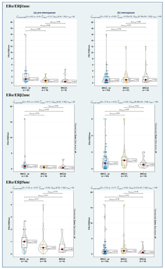 Violin plots depicting the relationship between ERα/ERβ1nuc (upper panel), ERα/ERβ2nuc (in the middle), and ERα/ERβ5nuc ratio (lower panel) in BRCA-wt, BRCA1, and BRCA2 mutated women according to menopausal status. Both overall and pairwise comparisons are reported, with FdR correction. Blue, yellow and grey dot respectively represents BRCA-wt, BRCA1 and BRCA2 patients pertaining that score of molecular marker.