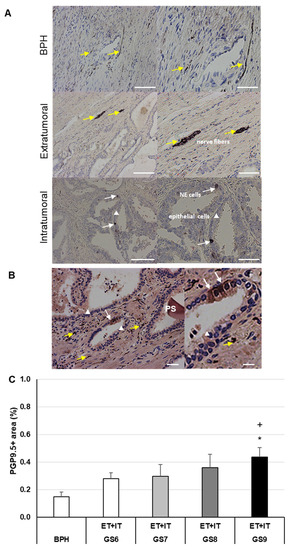 PGP9.5 (~UCHL1) IHC of human BPH and PCa. (A) Representative images of BPH and extratumoral [ET] or intratumoral [IT] PCa regions. (B) PGP9.5+ epithelial cells. Nerve fibers are marked with yellow arrows, PGP9.5+ neuroendocrine cells (NE) with white arrows, epithelial lining cells are indicated with a white triangle, and a prostate stone (PS) is also seen. (C) Percentage of PGP9.5+ area in BPH and PCa with different Gleason scores (GS). The data show means + SEM; significance: * p ≤ 0.05 vs. BPH; + p ≤ 0.05 vs. GS6. Scale bar from left to right (A) 200 and 100 µm; (B) 100 and 50 µm.