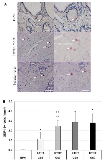 GDF-15 IHC of human BPH and PCa. (A) Representative images of BPH and extratumoral [ET] or intratumoral [IT] PCa regions. (B) Density of GDF-15+ cells in BPH and PCa (ET; IT) with different Gleason scores (GS). GDF-15+ cells are marked with white arrows. The data show means + SEM; significance: * p ≤ 0.05, ** p ≤ 0.01 vs. BPH; ++ p ≤ 0.01 vs. GS6. Scale bars: left column 200 µm, right column 100 µm.
