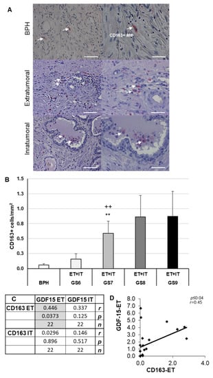 CD163+ MΦ IHC of human BPH and PCa. (A) Representative images of BPH and extratumoral [ET] or intratumoral [IT] PCa regions of CD163+ cells; CD163+ MΦ are marked with white arrows. (B) Density of CD163+ MΦ in BPH and PCa with different Gleason scores (GS). (C,D) Pearson’s correlation coefficient, a significant correlation was marked with gray. The data show means + SEM; significance: ** p ≤ 0.01 vs. BPH; ++ p ≤ 0.01 vs. GS6. Scale bars: left column 200 µm, right column 100 µm. Pearson product moment correlation between ET and IT of CD163+ and GDF-15+ (C,D). Correlation coefficient (r), p-value (p) and the number of samples (n).