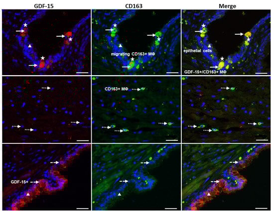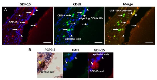 Using a double immunofluorescence technique, we identified colocalization of GDF-15-IR in CD68+ or CD163+ MΦ (Figure 5 and Figure 6). Interestingly, double immunoreactive GDF-15+/CD68+ were found as transepithelial migrating MΦ, whereas stromal CD68+ MΦ were not GDF-15+. Additionally, PGP9.5+ NE cells, which were occasionally GDF-15+, were observed in the glandular epithelium (Figure 5B). Some epithelial cells of the glandular epithelium were found to be GDF15+ (Figure 6).