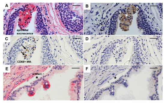 Epithelial cells with luminal excrescences in the prostatic gland. Representative immunohistochemistry of serial sections of GS6 PCa (A–D) or BPH (E,F), stained with GDF-15 (A,E), PD-L1 (B,F), CD68 (C), CD163 (D). White stars mark epithelial excrescence and black stars an artifact; black arrows indicate CD68+ MΦ. Nuclei were counterstained with hematoxylin; scale bar 100 µm.