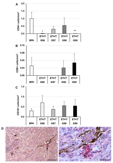 IHC of lymphocytes and nerve fibers in human BPH and extratumoral [ET] or intratumoral [IT] PCa regions. (A) Density of CD4+, T helper cells; (B) of CD8+, cytotoxic T cells; and (C) density of CD19+, B lymphocytes. The data show means + SEM; significance: * p ≤ 0.05, ** p ≤ 0.01, vs. BPH. (D) Representative photos of the contact (white star) between B lymphocytes (CD19+) and PGP9.5+ nerve fibers in PCa. The white arrows mark PGP9.5+ nerve fibers and black arrows mark clusters of B lymphocytes (CD19+). Nuclei were stained with hematoxylin. Scale bar from left to right 200 and 100 µm.