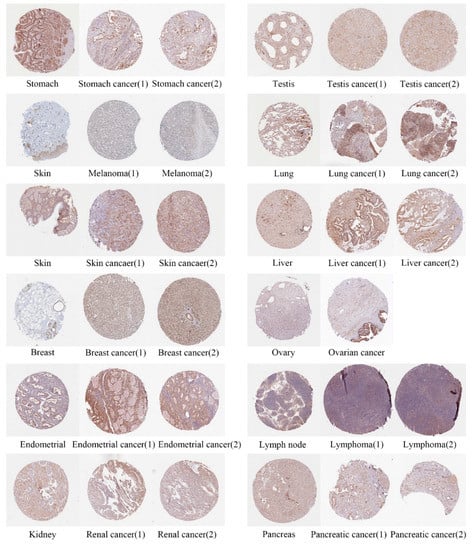 The HPA (https://www.proteinatlas.org/ (accessed on 15 February 2022)) database is based on proteomic, transcriptomic, and systems biology data, which can map tissues, cells, organs, etc. To continue to assess differences in GNL3L protein expression levels, immunohistochemical images of 20 tumors were studied from the HPA database.