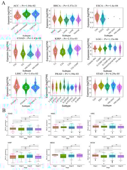 Correlation of GNL3L with cancer molecular subtypes and clinical stages. (A) GNL3L expression correlated with molecular subtypes in ACC, BRCA, ESCA, COAD, KIRP, LGG, LIHC, PRAD, and STAD. (B) Obvious discrepancy in GNL3L expression in dissimilar clinical stages in COAD, HNSC, KIRC, KIRP, MESO, and SKCM cancers. * p < 0.05; ** p < 0.01.