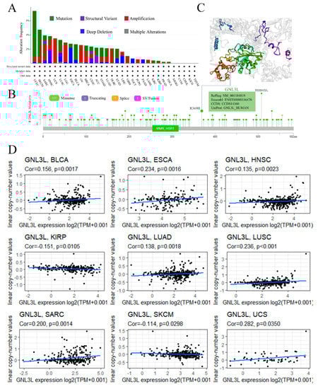 The genetic variation in the GNL3L gene was analyzed using the cBioPortal database (https://www.cbioportal.org/ (accessed on 15 February 2022)) [17]. At the same time, the cBioPortal database was used to download CNA data for 33 tumors, and R language was used for correlation analysis. R4.1.0 was used for data collation and analysis.