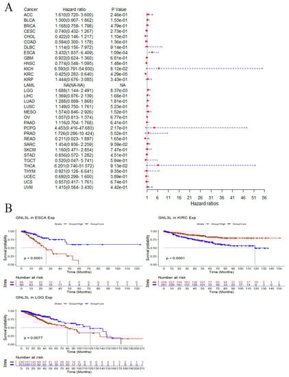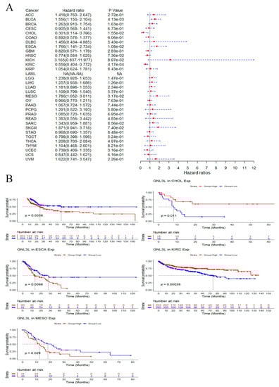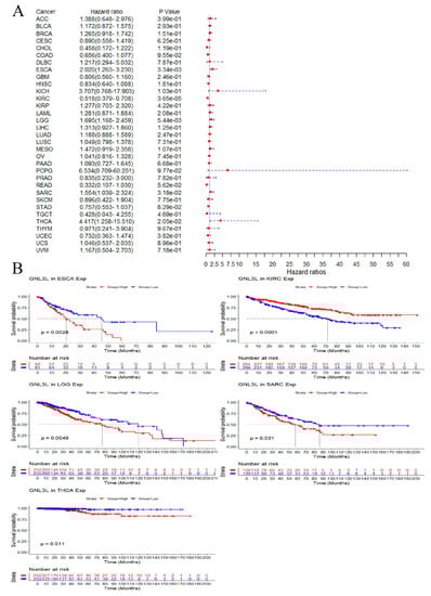 Correlation of GNL3L expression with OS in patients. (A) Forest plot of the OS risk ratio of GNL3L in 33 cancers. (B) Kaplan−Meier survival curves for patients with ESCA, KIRC, LGG, SARC, and THCA malignancies stratified by GNL3L expression levels.