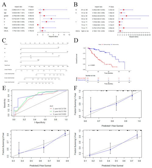 ESCA prediction model building and evaluation. (A) Forest plot of univariate Cox regression results. (B) Forest plot of multi-factor Cox regression results. (C) The nomogram based on GNL3L and M, T, and N stages. (D) Kaplan–Meier curves plotted after stratifying high−risk and low−risk patients based on median risk scores derived from the nomogram. (E) Evaluation of the ROC curve of the nomogram. (F) Evaluation of the calibration curve for the nomogram.