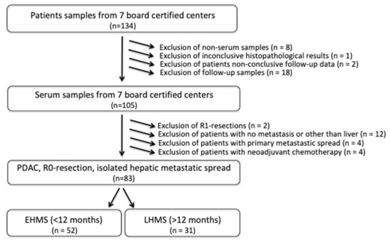 Biobanks from seven board-certified German tertiary referral centers for PDAC were screened for eligible patients. Patients diagnosed with PDAC without metastatic spread at the time of diagnosis and who underwent curative surgery (R0 resection) without previous neoadjuvant therapy between October 2007 and December 2019, either by Whipple procedure or left pancreatic resection, were considered eligible for the study. Further inclusion criteria were the development of isolated HM, either early (≤12 months, early hepatic metastatic spread (EHMS)) or late (>12 months, late hepatic metastatic spread (LHMS)) after surgery, and enough serum from the patients. Exclusion criteria were malignancy other than PDAC, primary R1-resection, metastatic spread to different sides than the liver, invalid follow-ups, or inconclusive clinical courses. Clinical courses and oncological data were retrieved from prospectively maintained clinical research databases of local biobanks. A R0 resection was defined as distance to resection margin >0.1 cm, while a R1 resection was present when the resection margin was involved [14].