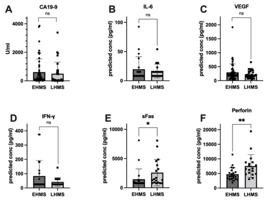 To identify factors correlated with EHMS and LHMS in PDAC patients, serum samples were analyzed for inflammatory mediators as well as the serum biomarker CA19-9 [26]. Values from three patients (EHMS: n = 2, LHMS: n = 1) were inconclusive and hence excluded from further analysis. Despite a trend towards slightly higher CA19-9 levels in patients with EHMS, no significant difference was detected between both cohorts (Figure 3A). Differences between the two groups for IL-2, IL-4, IL-8, IL-10, IL-17A, TNF-α, Granzyme A, Granzyme B and Granulysin (Supplementary Figure S1A–H) were insignificant. However, inflammatory mediators known to be involved in tumor progression and angiogenesis, such as IL-6 (Figure 3B) and VEGF (Figure 3C) were elevated in patients with EHMS, which was also observable for IFN-γ (Figure 3D). Interestingly, analysis of sFAS (Figure 3E) and Perforin (Figure 3F) showed significantly higher (p = 0.0102 and p = 0.0042, respectively) serum levels in patients with LHMS.