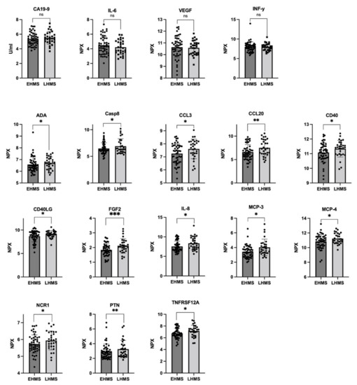 In line with our results shown in Figure 3A, Olink® analysis identified almost similar CA19-9 values in both PDAC patients with EHMS and LHMS, respectively (Figure 4 upper row, Supplementary Table S3). Furthermore, Olink® analysis determined slightly higher levels of IL-6, VEGF and IFN-γ in serum of EHMS patients (Figure 4 upper row, Supplementary Table S3), confirming these slight tendencies previously detected by LEGENDplexTM. Yet, Olink® analysis identified significantly higher serum protein levels of ADA, CASP8, CCL3, CCL20, CD40, CD40LG, FGF2, IL-8, MCP-3, MCP-4, NCR1, PTN and TNFRSF12A, in PDAC patients suffering from LHMS (Figure 4, Supplementary Figure S6, Supplementary Table S3).