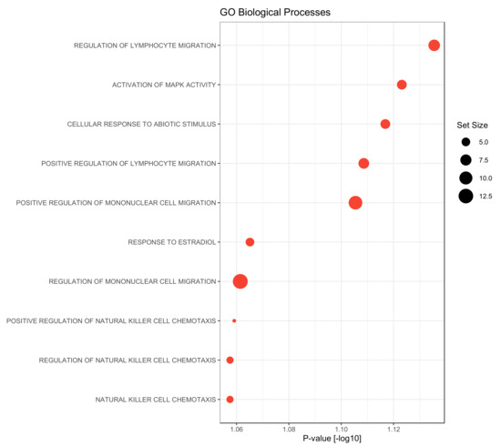 In a final step, a gene set enrichment analysis was performed using the gene ontology biological processes as gene sets. Compared to the late metastasizing group, we found only the GO-terms “cell maturation” as significantly up-regulated in the serum of PDAC patients with EHMS (p-value = 0.047). Contrary to this, factors that were elevated in the LHMS group could be associated with diverse processes: besides activation of MAPK activity or cellular responses to abiotic stimuli or estradiol factors could be associated particularly with the migration of lymphocyte and mononuclear cells but also with chemotaxis of natural killer cells (Figure 5). Overall, this analysis reveals a strong association of significantly elevated factors in serum of LHMS patients with processes involved in the recruitment and migration of immune cells.