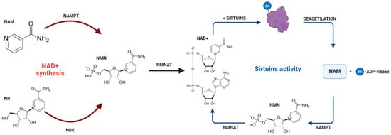 In mammals, the Sirtuins (SIRTs) have extremely conserved expression from SIRT1 to SIRT7. The overexpression of SIRTs is associated with increased cellular survival and are reported to be linked to the deacetylation of lysine moieties [15]. SIRTs are homologous to the gene Sir2 (Silent information regulator-2) and are NAD+ hydrolysis-dependent. SIRTs are particularly important in disease prevention and in reducing the effects of aging and cancer [15,16,17]. Attached to the effects of aging, the production of NAD+ tends to be decreased, which reflects on the poor development of dependent processes. However, studies identifying the precursors of NAD+ can restore the effect of SIRTs in aged organisms [18,19,20]. Figure 1 describes the biochemical process that guides the synthesis of NAD+ and its deacetylation activity together with the SIRTs.