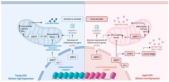 SIRT7 is localized in the q25.3 region of chromosome 17, which is commonly altered in several hematological diseases. In aging, SIRT7 levels are reduced when compared to young individuals [25]. The HSCs present senescence phenotypes during aging because of the reduction on SIRT7 expression. SIRT7 is attached to the initiation of the Transposon LINE1 pathway activation and, consequently, to cGAS-Sting, which is characterized by an increase in NF-kB, P65, TBK-1 and IRF3, as well as the loss of stability in heterochromatin [26].