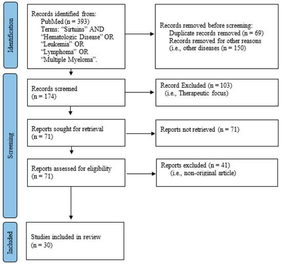 Based on the MeSH terms used initially, this systematic review retrieved 393 article records (Figure 3). In the identification step by PRISMA, [35] a total of 219 articles were excluded for being duplicates (n = 69) and/or for other reasons, such as other diseases (n = 150). Thus, 174 articles were registered for the screening phase. According to the title and/or abstract of the remaining 117 articles, 103 articles not related to pathogenesis of hematological diseases were excluded. The complete files of the articles were obtained (n = 71). Of those 71 remaining articles, 41 studies related to research meta-analysis or review studies were excluded. Finally, a total of 30 articles were included in this systematic review study and the main findings are included in Table 1.