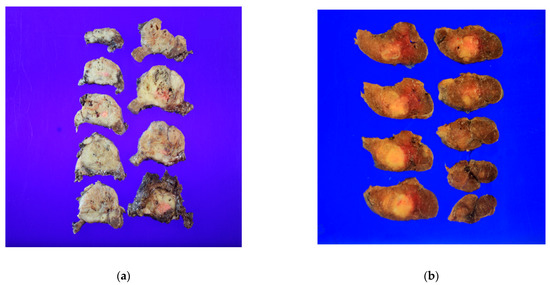 Gross picture of the specimen: (a) a specimen with gross extrathyroidal extension; (b) a specimen without gross extrathyroidal extension.