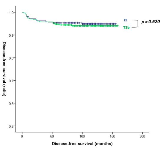 Disease-free survival curves of the T2 and T3b groups (p = 0.620 by log-rank test).