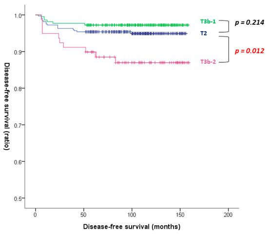 The baseline clinicopathological characteristics of patients with T2, T3b-1, and T3b-2 disease are presented in Table 3. There were 217 patients with T3b-1 and 79 patients with T3b-2 disease. Patients with T3b-1 and T3b-2 disease had older age (p < 0.001); more extensive surgery (p < 0.001); and higher rates of multifocality (p = 0.002, p = 0.010, respectively), bilaterality (p < 0.001), and lymphatic invasion (p = 0.017, p < 0.001, respectively) compared to patients with T2 disease. Both N stage and TNM stage were significantly more advanced in patients with T3b-1 and T3b-2 disease than patients with T2 disease (T3b-1, p = 0.002, p < 0.001; T3b-2, p < 0.001, and p < 0.001, respectively). However, no significant difference in the rate of recurrence was observed between T2 and T3b-1 (4.9% vs. 2.8%; p = 0.212). Conversely, a significantly higher rate of recurrence was observed in patients with T3b-2 disease compared to patients with T2 disease (12.7% vs. 4.9%; p = 0.012).