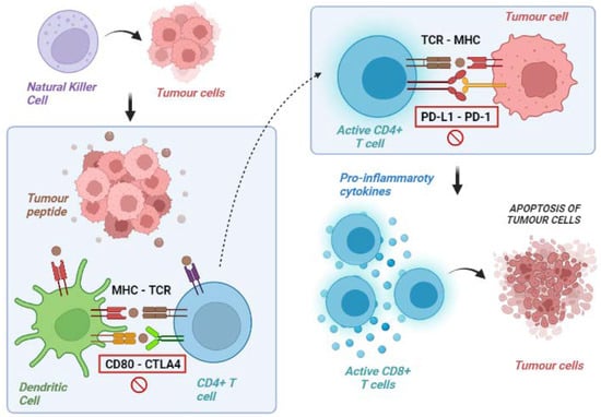 On the other hand, cancer cells can develop a series of resistance mechanisms aimed at evading the host’s immune control. Namely, tumour cells can acquire the ability to express molecules that inhibit the immune response or reduce the expression of the MHC complex in APCs [16,17]. The most known immune checkpoint molecules are CTLA4, PD-1 and its ligand PD-L1, and lymphocyte-activation gene 3 (LAG-3). All of them are receptors expressed on the membrane of T cells in different phases. They counterbalance lymphocyte activation in physiological conditions to avoid unnecessary tissue damage, chronic inflammation, and uncontrolled lymphocytic proliferation.