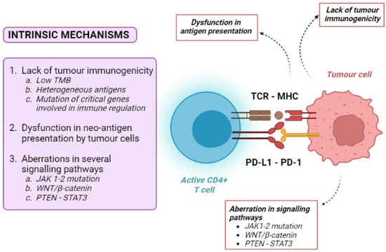 Tumour intrinsic mechanisms include a lack of tumour immunogenicity (low TMB, heterogeneous antigens, mutation of critical genes involved in immune regulation), defective antigen presentation, and aberrations in several signalling pathways (Figure 2).