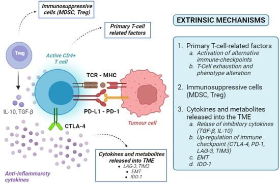 Tumour-extrinsic mechanisms are mainly due to the immune-suppressive effect of TME. They include primary T-cell-related factors (activation of alternative immune checkpoints, T-cell exhaustion and phenotype alteration), immunosuppressive cells, cytokines and metabolites released into the TME (Figure 3). As the TME includes immune cells, blood vessels, fibroblasts, signalling molecules, and the extracellular matrix surrounding tumour cells, many factors can contribute to the development of an immune-suppressive TME [36].