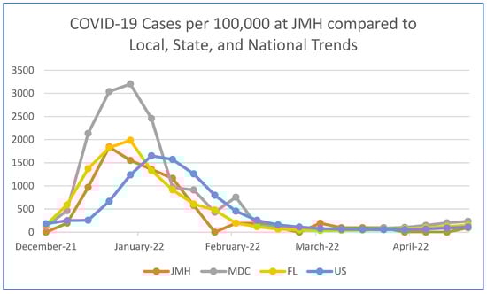 COVID-19 cases per 100,000 people in the JMH Hematology/Oncology clinic population compared to Miami-Dade County (MDC), the State of Florida (FL) [5], and the United States (US) [1].