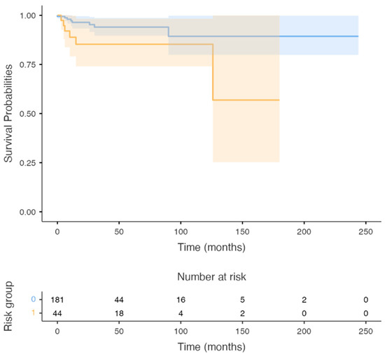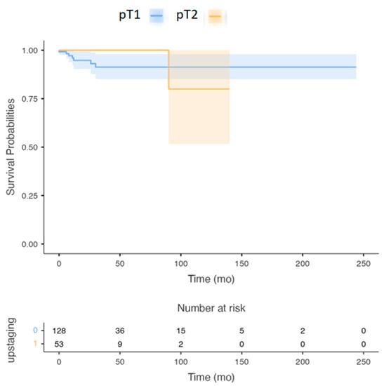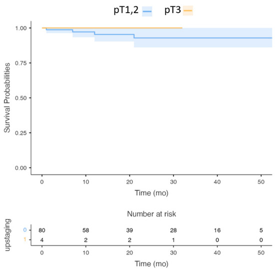 Group (2): The OS of patients upstaged to pT3 (from pT1, pT2N0M0) was 94% (CI: 89–96%), compared with 92% (CI:89–97%) in patients who remained in pT1 and pT2 N0M0 (p-value = 0.082, Figure 2).
