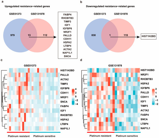 The common differential expressed genes (co-DEGs) associated with platinum resistance between GSE51373 and GSE131978. (a) Thirteen co-upregulated platinum-resistant-related genes (FABP4, RHOBTB3, TIMP3, IGF1, IGFBP6, NR2F1, PALLD, CDH11, HSPA2, LTBP4, ACTA2, NAP1L1, and SNCA) were identified in ovarian cancer (OC) tissues. (b) One co-downregulated gene (HIST1H2BD) was identified in OC tissues. (c,d) Heatmaps of 14 co-DEGs between platinum-resistant and sensitive tissues.