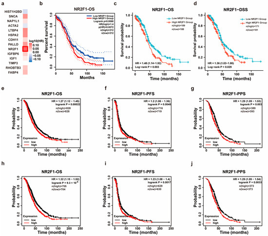 The prognostic significance of co-DEGs expression in OC patients was explored by applying the GEPIA2. As illustrated in Figure 2a, the expression of NR2F1 had the most significant relationship with OC patients’ OS (HR = 1.4, p = 0.0068), whereas others DEGs showed no obvious significance (p > 0.05) (Figure 2a,b). As well, patients with higher NR2F1 levels displayed inferior OS (HR = 1.48, p = 0.003) and DSS (HR = 1.36, p = 0.029) based on Xiantao tool (Figure 2c,d). Consistently, the Kaplan-Meier plotter demonstrated that the NR2F1 expression was prominently connected to shorter OS (HR = 1.27, p = 0.00022), PFS (HR = 1.2, p = 0.0045), and PPS (HR = 1.29, p = 0.003) in patients with OC (Figure 2e–g). Additionally, highly expressed NR2F1 also displayed poorer OS (HR = 1.32, p = 9.3 × 10−5), PFS (HR = 1.23, p = 0.0017), and PPS (HR = 1.29, p = 0.0033) in OC patients receiving platinum (Figure 2h–j). The univariate and multivariate Cox regression analyses were conducted for examining NR2F1’s ability to independently predict adverse OC prognoses. The results implied that NR2F1 was independently correlated with unfavorable OS after adjustment for stage, primary therapy outcome, race, age, grade, anatomic neoplasm subdivision, lymphatic and venous invasion, and tumor residual disease (Table 1). Taken together, these findings reveal that NR2F1 might act as an independent prognostic biomarker in OC.