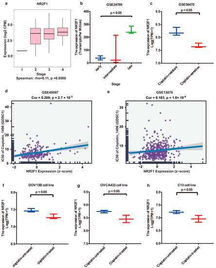Through analysis of HPA, GTEx, and FANTOM5 datasets, a relatively high expression of NR2F1 was detected in normal ovary tissues compared to indicated organs (Figure S1). Furthermore, TISIDB and GSE24789 were further used to investigate the tendency of NR2F1 expression in OC at different clinical stages. The expression of NR2F1 in OC was marginally enhanced in advanced stages (Spearman’s r = 0.11, p = 0.0566) (Figure 3a). Similarly, NR2F1 levels of MOSE cells at a late stage were significantly increased than those of MOSE cells at an early stage (p < 0.05) (Figure 3b). The connection between NR2F1 levels and OC patients’ clinical parameters was also probed using the detailed clinical description of an OC tissue array. As shown in Table 2, the expression of NR2F1 exhibited a positive relation to pathologic stage (p < 0.001) as well as the T stage (p = 0.003), yet showed a negative relation to N (p < 0.001) and M stages (p = 0.001). Moreover, there was no significant relationship between NR2F1 expression and age (p = 0.054), ki67 intensity (p = 0.140) and extent (p = 0.057), and EGFR intensity (p = 0.614) and extent (p = 0.450). Additionally, NR2F1 expression and specific genetic mutation related to OC were acquired from TCGA and ICGC cohorts. Based on the TCGA database, no significant difference was observed in BRCA1 (p = 0.3512), BRCA2 (p = 0.6746), and TP53 (p = 0.9223) mutant patients compared to wild-type (Figure S2a–c), while NR2F1 expression was significantly reduced in the ARID1A mutant group (p = 0.0238) biased with relatively small sample sizes (Figure S2d). As for the ICGC dataset, no significant differences were observed in BRCA1 (p = 0.9626), BRCA2 (p = 0.5586), and ARID1A mutant (p = 0.9225) patients compared to wild-type (Figure S2e–g). Then, decreased expression of NR2F1 was validated in cisplatin-resistant OC IGROV-1 cell lines using GSE58470 (p < 0.05) (Figure 3c). In parallel, the association of NR2F1 expression and cisplatin sensitivity was analyzed by the BEST portal. NR2F1 expression was positively correlated with IC50 values of cisplatin in OC related datasets GSE49997 and GSE13876 (both p < 0.05) (Figure 3d,e). Moreover, to further identify the effect of NR2F1 on the treatment outcomes of platinum, the expression levels of NR2F1 in GSE47856 associated with cisplatin chemotherapy were checked. Treatment with cisplatin downregulated NR2F1 expression in OC DOV13B, OVCA433 and C13 cell lines (all p < 0.05) (Figure 3f–h). The above findings indicated that NR2F1, a platinum resistance-related gene, was positively correlated with OC progression and might influence the chemotherapy response of OC.