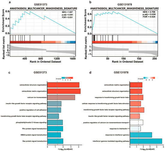 GSEA analysis and GO enrichment analyses of platinum-resistant-associated DEGs. (a,b) GSEA analysis of DEGs in GSE51373 and GSE131978. (c,d) GO (Biological Process) enrichment analyses of DEGs in GSE51373 and GSE131978. Only pathways of interest showing a p-value < 0.05 are presented.