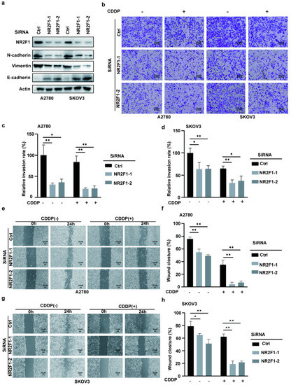 As a critical step for supporting tumor invasion and migration, EMT has been validated as an essential pathway in OC platinum resistance [39]. To explore the function of NR2F1 in EMT signaling, multiple EMT markers, encompassing E-cadherin, N-cadherin, and vimentin after NR2F1 knockdowns were examined. As demonstrated in Figure 5a, siNR2F1-transfected A2780 and SKOV3 cells showed enhanced E-cadherin, as well as reduced N-cadherin and vimentin. To further evaluate NR2F1-mediated EMT upon platin treatment, wound-healing and transwell assays were exploited for checking the invasive and migratory capacities with or without cisplatin treatment. Knocking down NR2F1 repressed the invasion (Figure 5b–d) and migration (Figure 5e–h) in A2780 and SKOV3 cells, while the inhibitory effects were more significant in cisplatin treatment groups. These findings implied that NR2F1 might be responsible for resistance to platinum via the induction of EMT.