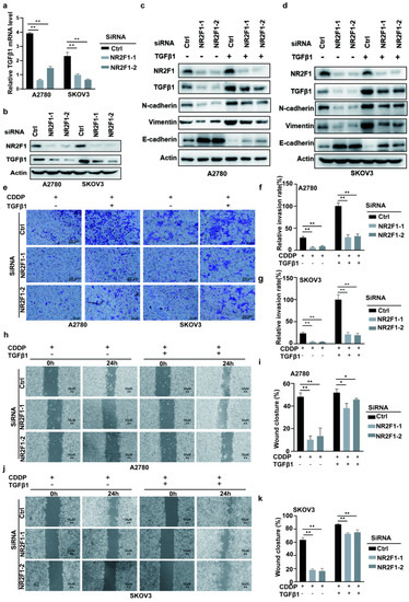 NR2F1 induced epithelial to mesenchymal transition (EMT) via upregulating TGF-β1 expression. (a,b) Assessment of TGF-β1 expression in siNR2F1-transfected A2780 and SKOV-3 cells using RT-PCR and western blot. (c,d) SiNR2F1-transfected A2780 and SKOV-3 cells were treated with TGF-β1 (5 ng/mL) or without TGF-β1, and protein expression of NR2F1, TGF-β1, E-cadherin, N-cadherin, and vimentin was determined through western blot. The uncropped blots are shown in File S1. (e–g) After cisplatin (20 μM) treatment, siNR2F1-transfected A2780 and SKOV-3 cells were treated with TGF-β1 (5 ng/mL) or without TGF-β1, and the invasiveness was examined using transwell assay. (h–k) After cisplatin (20 μM) treatment, siNR2F1-transfected A2780 and SKOV-3 cells were treated with TGF-β1 (5 ng/mL) or without TGF-β1, and the migration was examined using wound-healing assay. CDDP, cisplatin; * p < 0.05; ** p < 0.01.