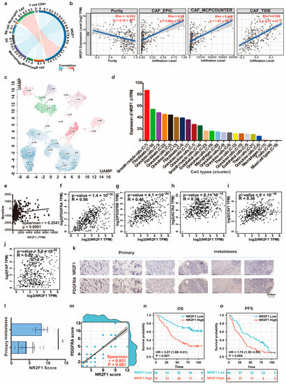 NR2F1 positively linked with cancer-associated fibroblast (CAF) infiltration. (a) The connection between NR2F1 and multiple kinds of tumor-infiltrating immune cells in OC by XCELL algorithm. (b) The association between NR2F1 and the infiltration of CAFs in OC according to EPIC, MCPCOUNTER, and TIDE algorithms. (c,d) The UMAP plot and the bar chart visualized NR2F1 expression in the single-cell types clusters in ovary tissues. (e) The relationship between NR2F1 with stromal score generated utilizing ESTIMATE algorithm, according to TCGA OC dataset. (f–j) The relationship between NR2F1 and markers of CAFs including PDGFRA, PDGFRB, ACTA2, CAV1, and FAP in GEPIA2. (k) Representative images of NR2F1 and PDGFRA protein expression in metastases and primary OC tissues. (l) NR2F1 was upregulated in metastases versus primary OC tissues. ** p < 0.01. (m) The relationship between NR2F1 and PDGFRA in all OC tissues. (n,o) Kaplan-Meier survival analyses of NR2F1 on OS, PFS in all OC patients.