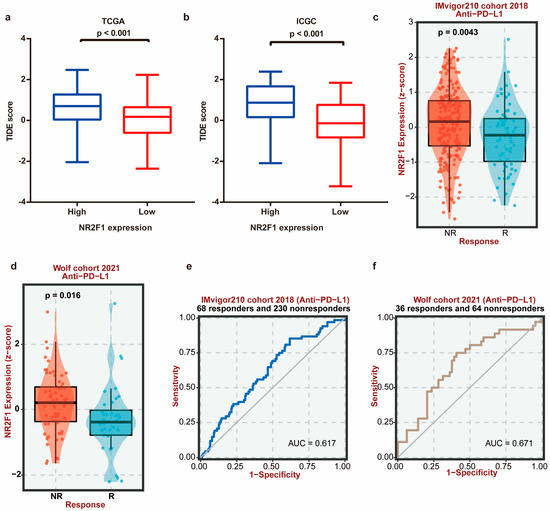 High NR2F1 expression predicts poor immunotherapeutic response. (a,b) High NR2F1 expression group displayed higher TIDE scores than the low-expression group in TCGA and ICGC OC datasets. (c,d) NR2F1 expression was increased in anti-PD-L1 responding patients relative to non-responding patients according to IMvigor210 cohort and Wolf cohort. NR: non-responders; R: responders (e,f) receivers operating characteristic (ROC) curves of NR2F1 for patients in IMvigor210 cohort and Wolf cohort.