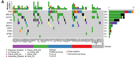 As summarized in Figure 1A, the TP53 somatic mutation rate (36%) and its increased frequency in HER2-enriched/TNBC subtypes (Table 1) were consistent with previous findings [37,38,39,40], which validated the accuracy and reliability of our targeted sequencing results. Interestingly, we found that the mutation frequency in HR coding regions (15%) is lower than that for BRCA2 (23%), but higher than those of other BC susceptibility genes including BRCA1 (7%), ESR1 (3%), and PTEN (3%) (Figure 1A). Unlike higher TP53 mutations in HER2-enriched/TNBC subtypes, HR mutations had a relatively even distribution among different subtypes (Table 1). Notably, multiple HR-mutation types were detected in the same patient in approximately 50% patients with HR mutations (indicated by black bars in Figure 1A), whereas the other genes were affected predominantly by missense mutations (indicated by green bars in Figure 1A), suggesting a higher genetic instability of the HR gene locus in a subset of patients.